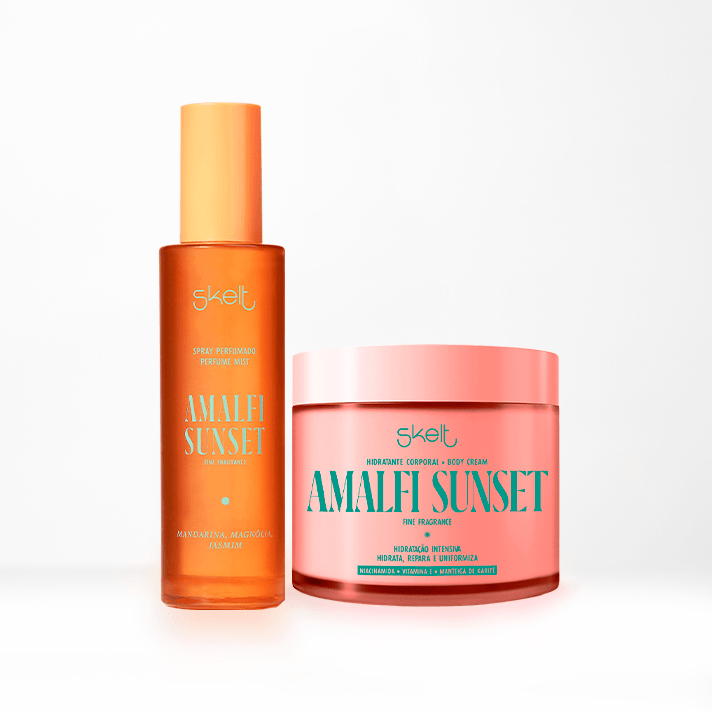 O Duo Amalfi Sunset da Skelt combina o Perfume Mist e o Body Cream da linha em um ritual completo de cuidado corporal, com fragrância cítrica floral solar e ativos que promovem hidratação intensa e revitalização da pele. É o kit ideal para quem deseja unir leveza, frescor e bem-estar em todos os momentos do dia.