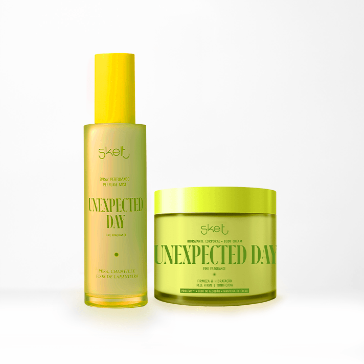 O Duo Unexpected Day é uma fonte de energia para enfrentar o dia. Com notas refrescantes de pera e maçã verde, proporciona uma sensação revigorante. Aliando a perfumação e hidratação, deixando-a suavemente perfumada e macia. Com delicadas flores de violeta e laranjeira adicionam sofisticação, enquanto a baunilha e o chantilly trazem conforto doce.